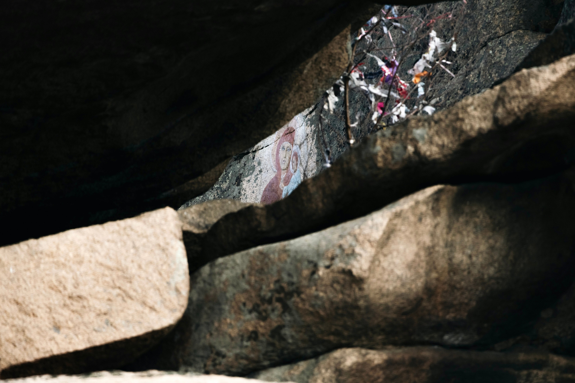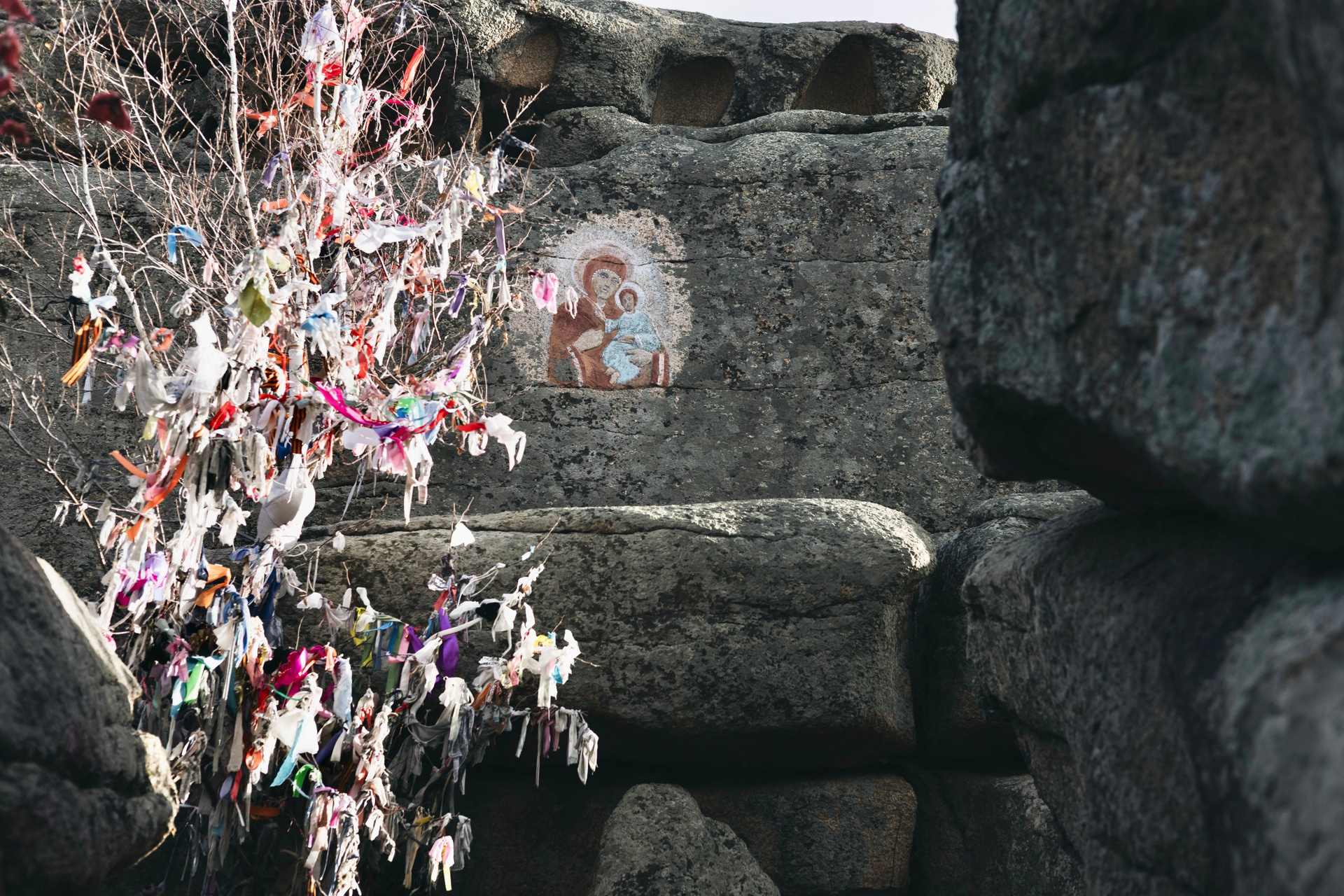 Популярно место и у православных паломников, добавляет наша провожатая. Одни едут, чтобы попросить о помощи, другие — поблагодарить. Икона, конечно, рукотворная, появилась здесь в конце 1990-х. Ее автор — местный житель Евгений Андреевич Тележкин. Он не был ни профессиональным иконописцем, ни скульптором, просто однажды решил выбить на скале икону. И долго-долго ездил на старенькой «Ниве» по окрестностям, искал подходящее место.