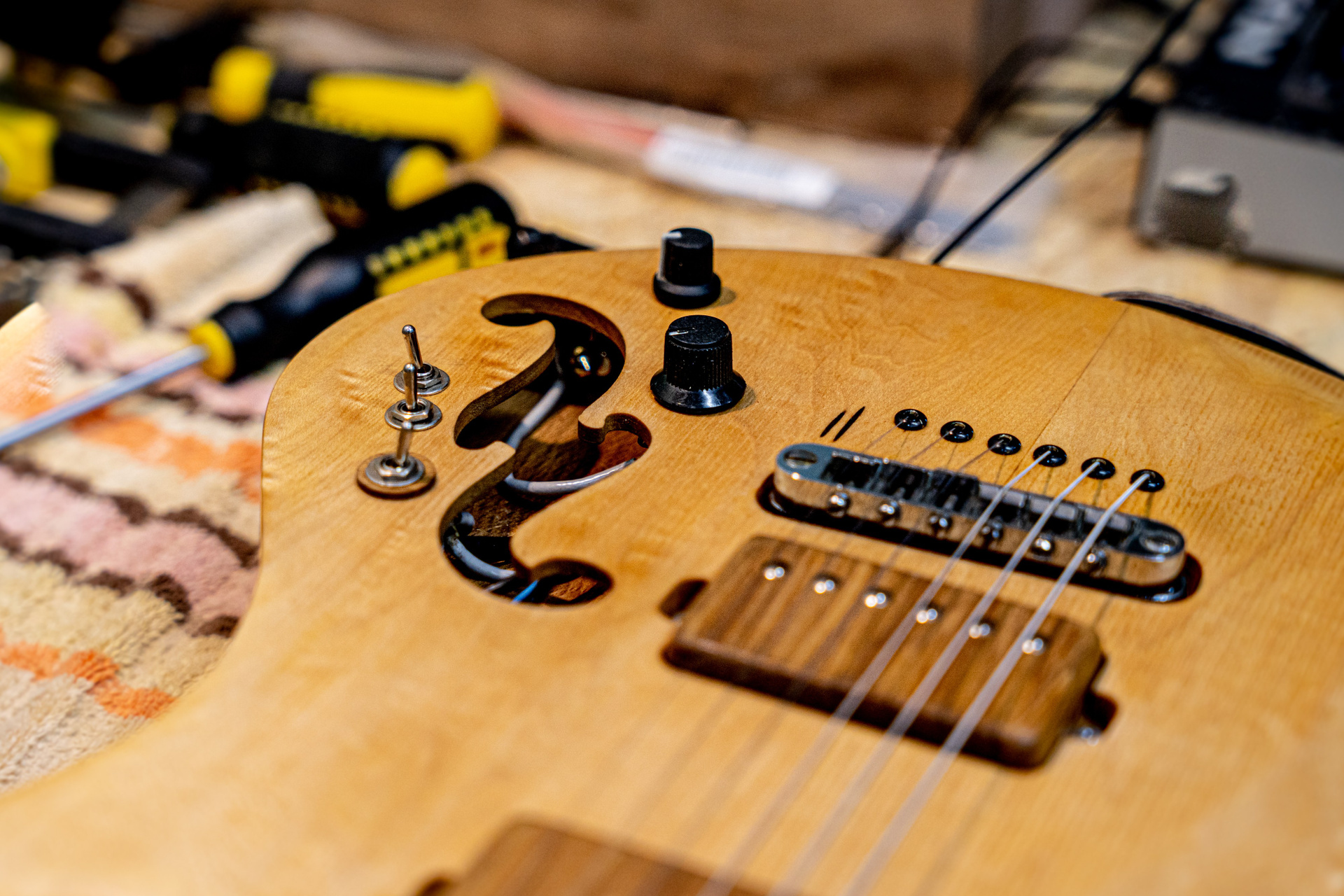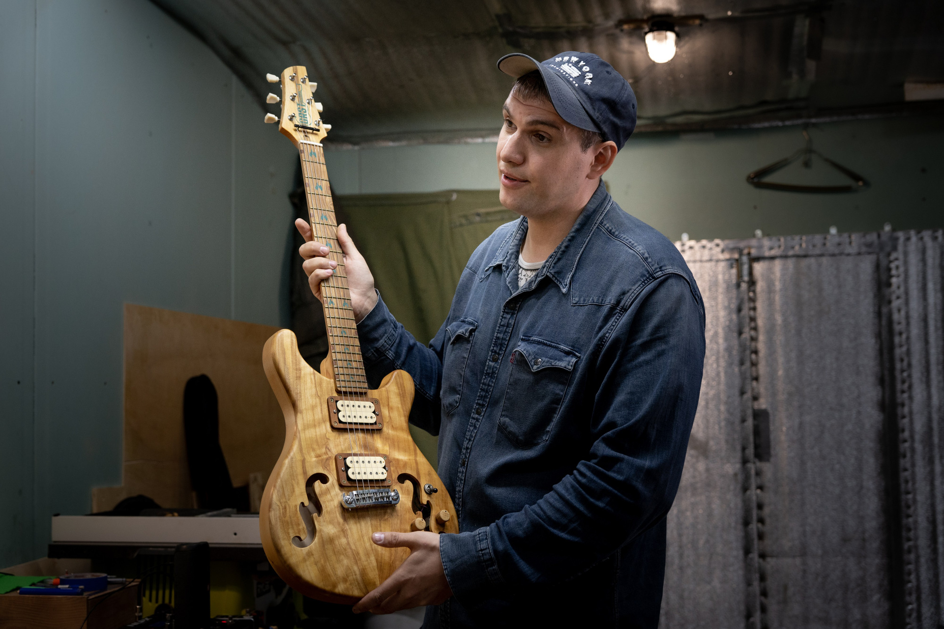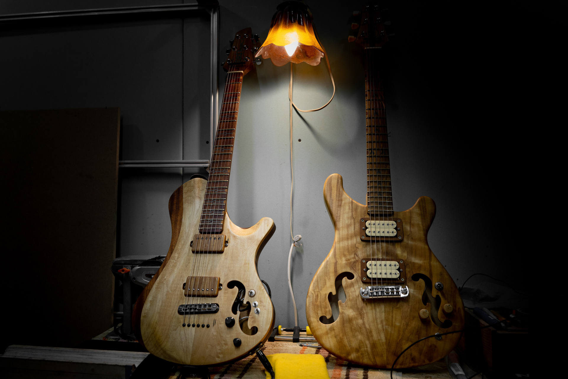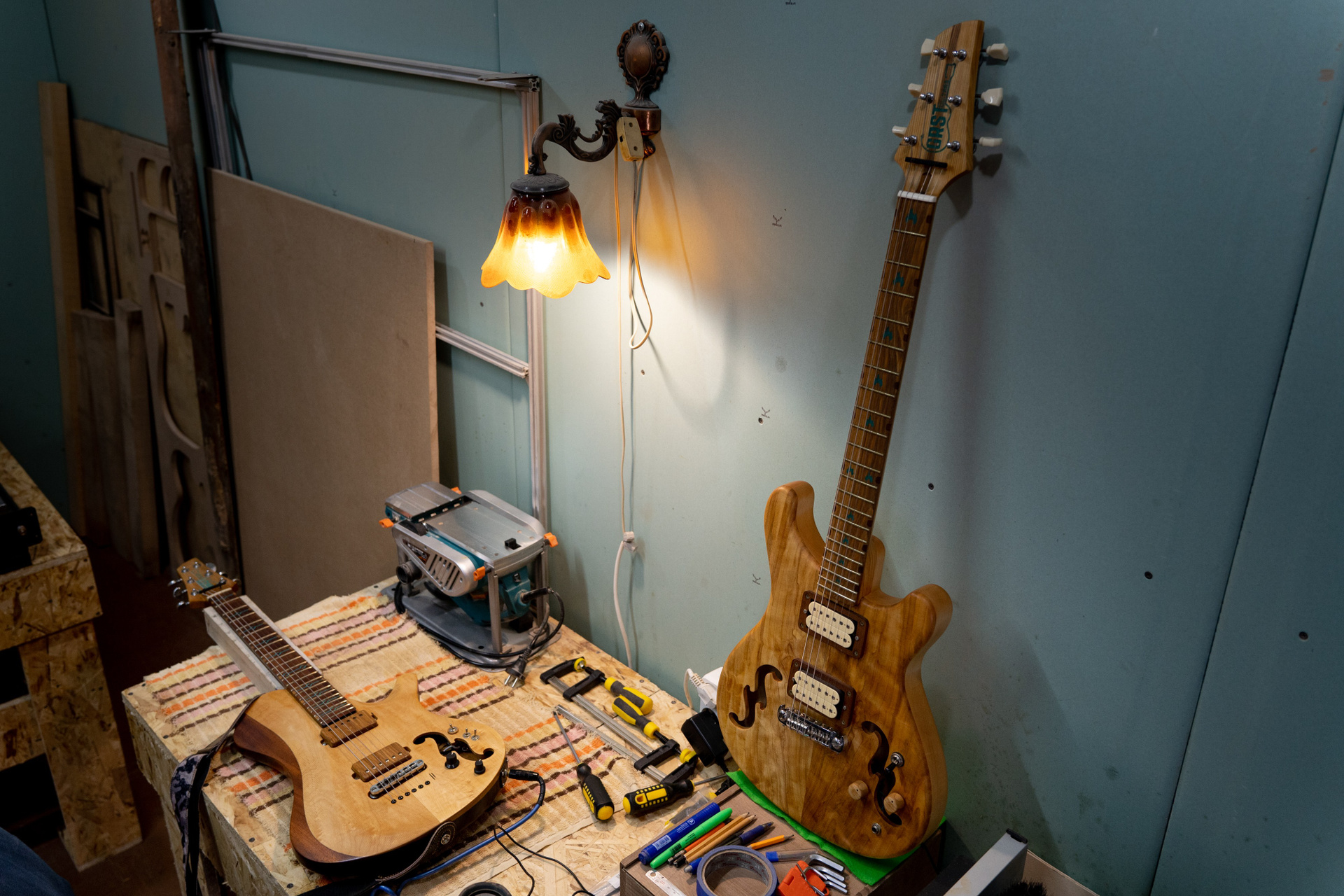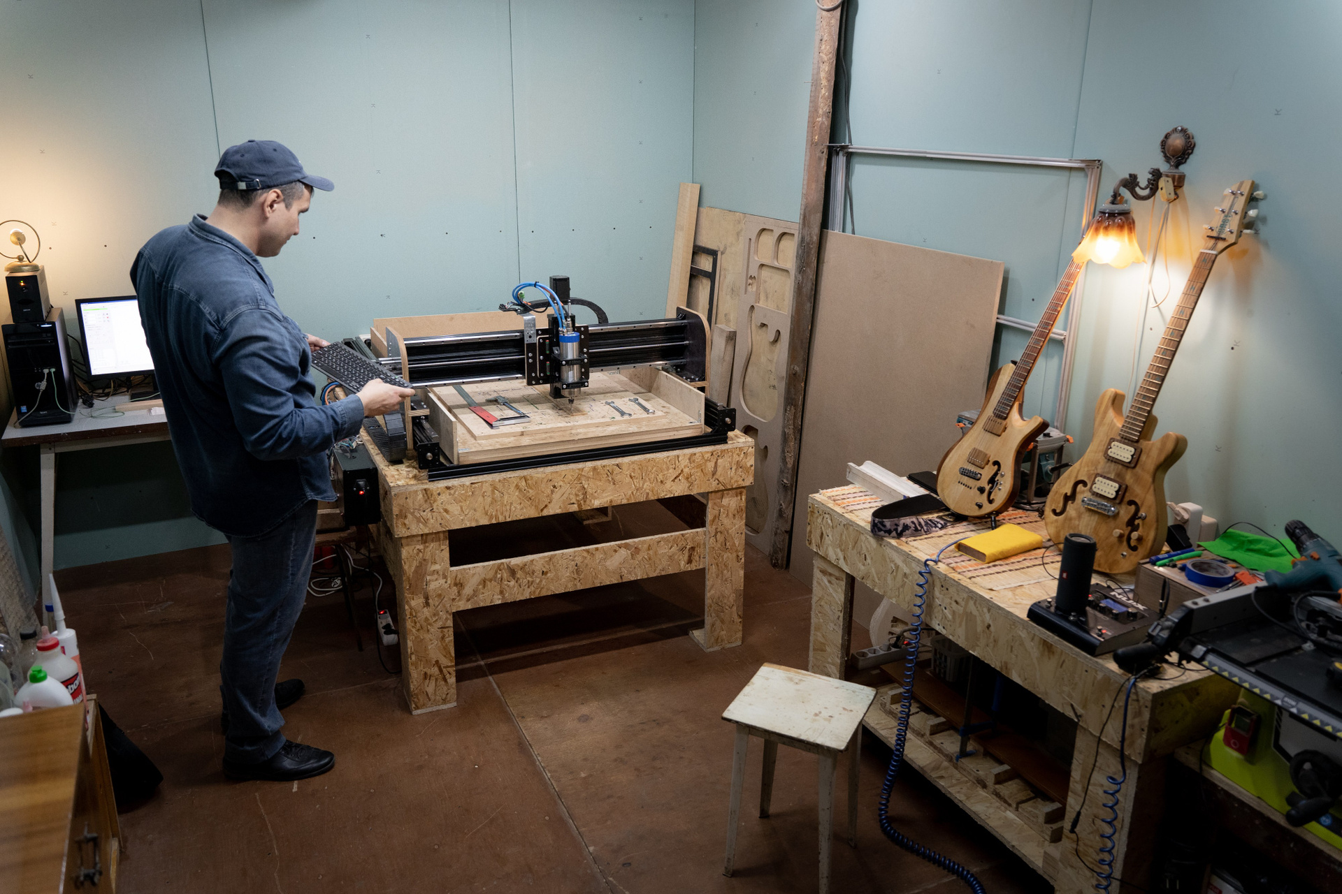 Гитарная мастерская Владимира Иванова расположена в промзоне на границе Калининского и Тракторозаводского районов — в поселке Нижний Плановый. Большую его часть занимают ряды гаражей, но встречаются и старые частные дома. Проезды здесь узкие, пахнет краской, соляркой, мусоркой. В каждом втором боксе — какой-то бизнес: ремонтируют машины, делают тюнинг и даже выращивают микрозелень. Владимир купил здесь гараж тоже не для того, чтобы ставить автомобиль. Год ушел на ремонт и утепление помещения. Теперь он собирает здесь гитары.